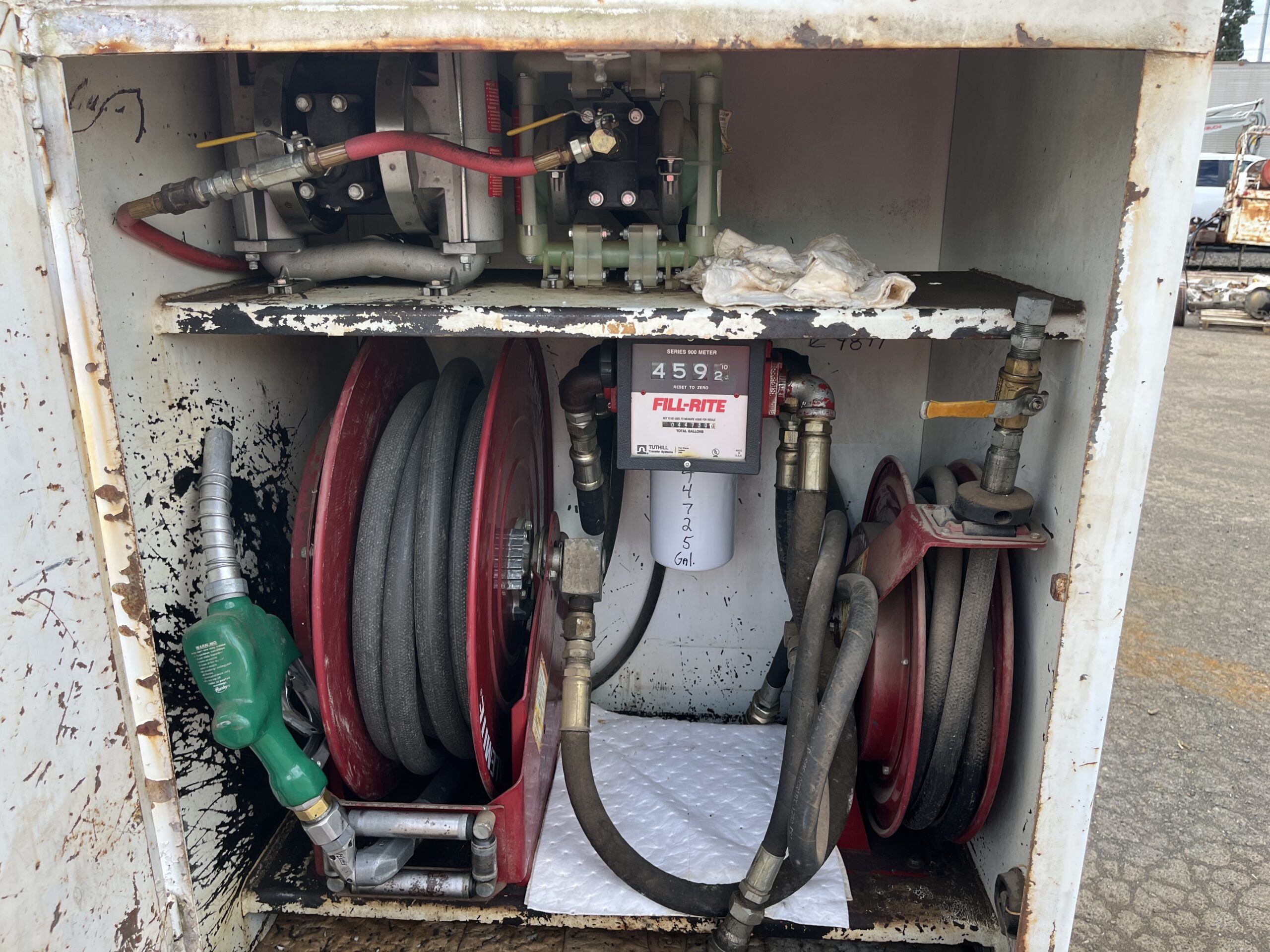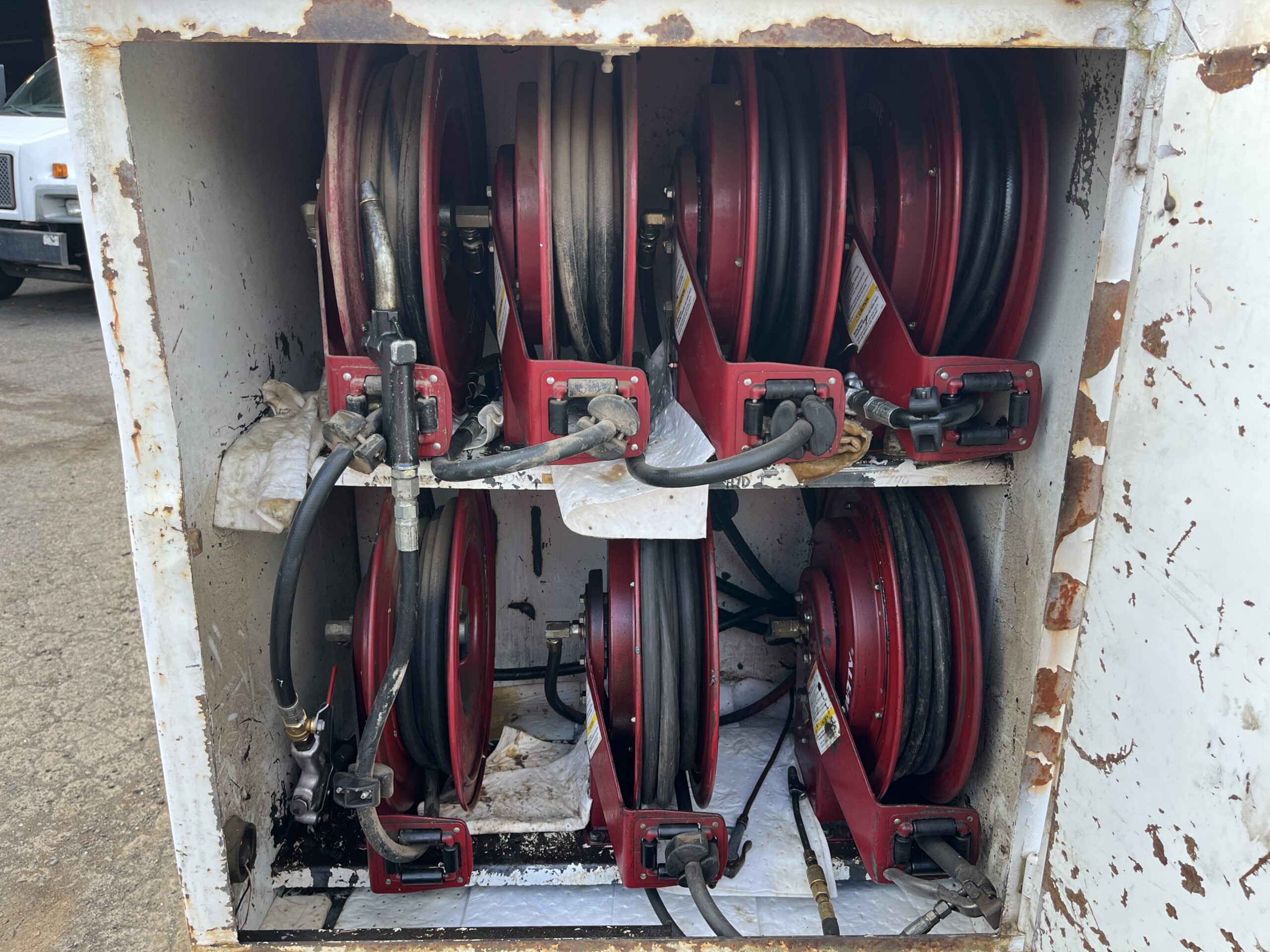 5 Lube Tanks, Fuel Tank, Waste Oil Tank Hose Reels